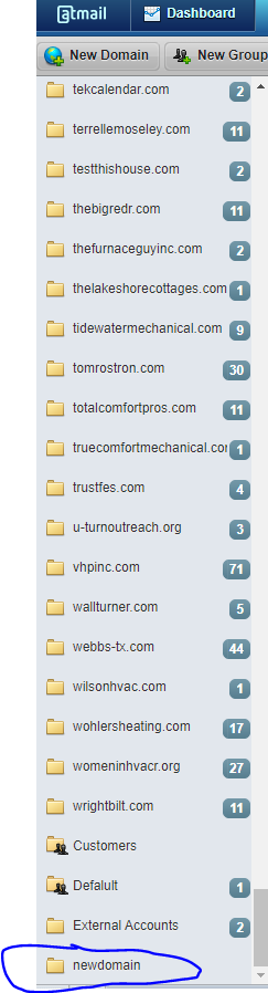 When you click either button, a folder will appear on the bottom of the list with the words "newdomain" in a box. Here you can rename the folder to the customers domain. For this example, you would do besthvacintown.com, NOTE: Update the name right away, as clicking elsewhere will leave the name as "newdomain" and you can't edit the name of a folder once it has been created, so make sure you put the domain in first and spell the domain correctly or you will have to delete the folder and try again.