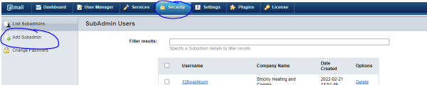 Once inside security, click Add Subadmin on the left hand side.