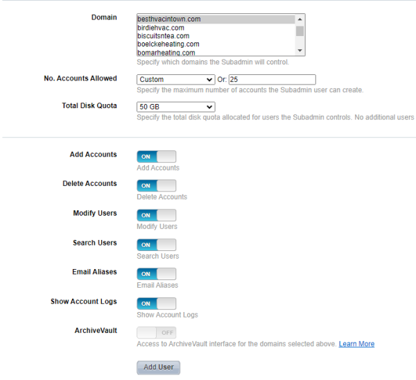 For number of accounts allowed, this depends on the package they have with us. Check and see what package they have, and give them the correct amount of email accounts and storage space.