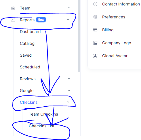 Next, on the left hand side, click Reports then Checkins and then Checkins List.