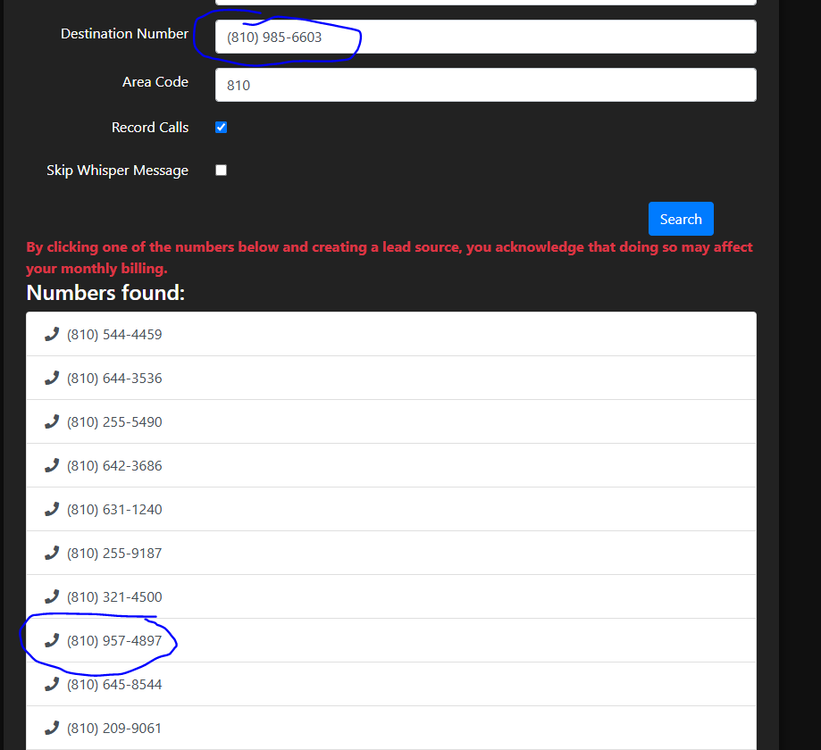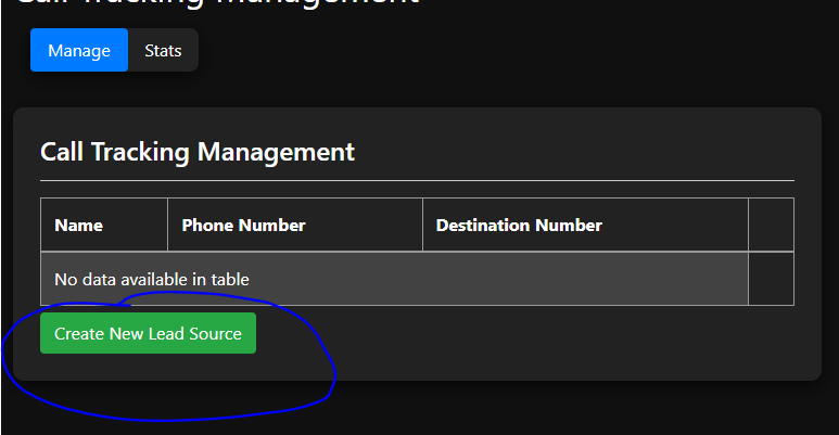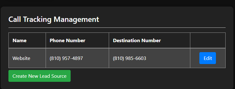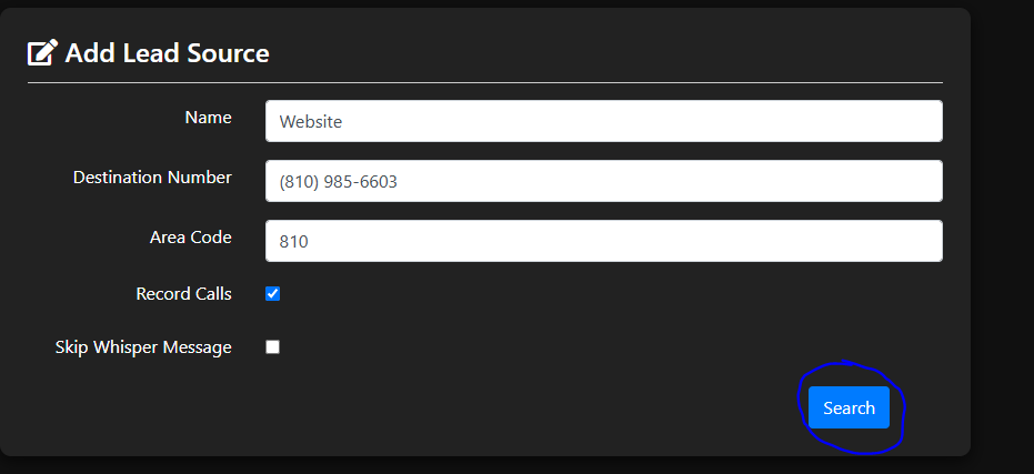 Enter the name for the type of lead (Website, OA, Facebook, etc.), then put in the companies current phone number for the destination number field. Put in the companies area code in the field below.