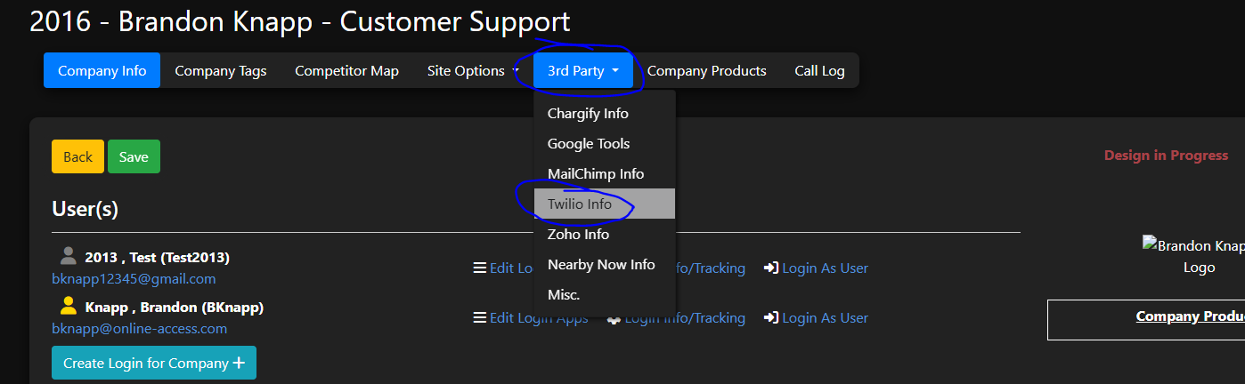 Next, go into the Companys 3rd Party tools and click on Twilo Info.