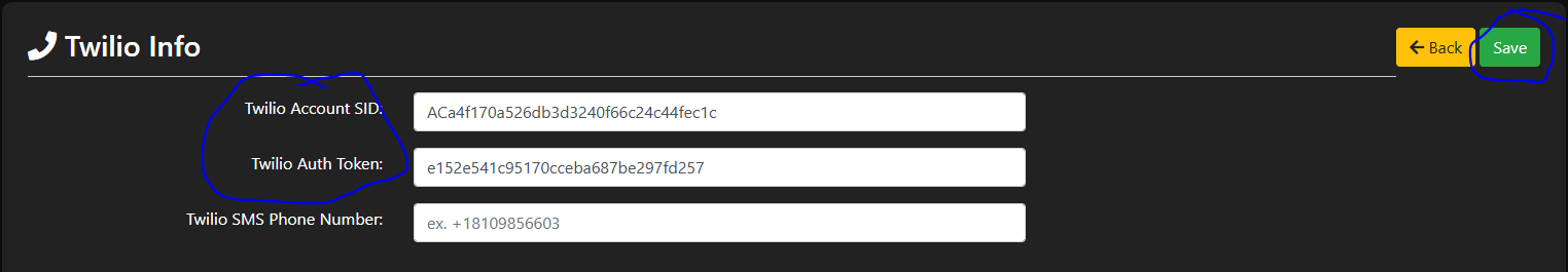In the Twilio Account SID: put this ACa4f170a526db3d3240f66c24c44fec1c
