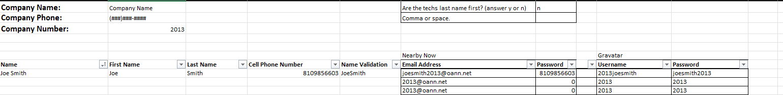 Open the document and put in the Company Name, Phone Number, and CID in the top. Then look at the Zoho ticket that was generated when the customer signed up and put in the technicians Full name in the Name field. Then put the phone number provided in the Cell Phone Number field and the username/email address and password will be generated.