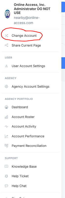 Once you are in the agency account, click the top right hand corner and choose Change Account.