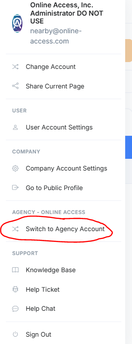 Go to https://admin.nearbynow.co/ and sign into the nearby@online-access.com account. Once signed in, click the top right hand corner and choose Switch to Agency Account.