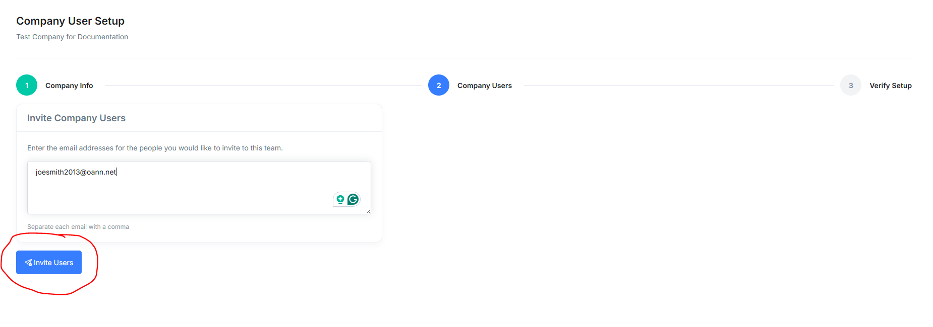 Next, put in the email address for the users you want to invite to the Company. You can get this list from the NBN Template sheet we moved over to this companies folder earlier. If you have more than 1 person to add, seperate each email address by a comma. When done, click Invite Users.