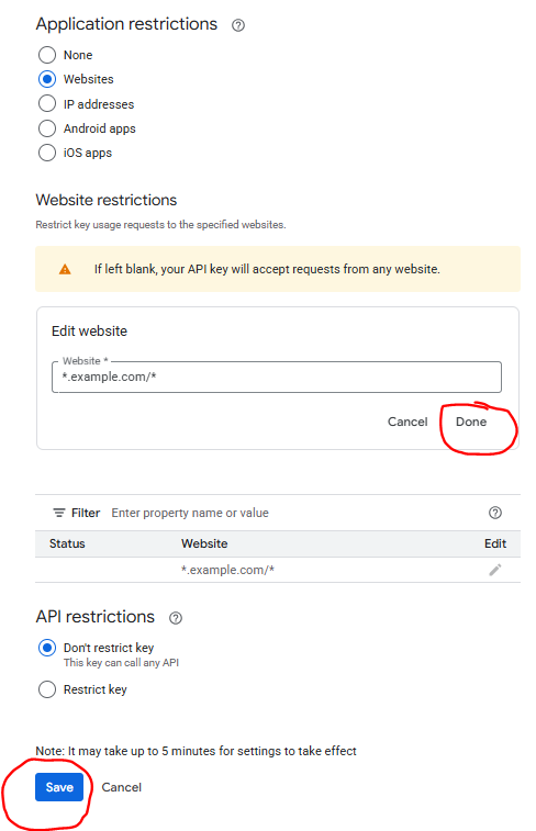 Click Websites for the Application restrictions. Click Add and then put in the website domain, but you have to put it in this style: *.domain.com/* and then click Done.