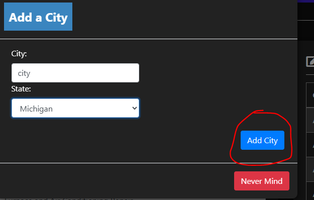 Ensure the cities on the right hand side are correct. If they are not correct, add a city by clicking the Add a City button then typing in the city and picking the state then clicking Add City.