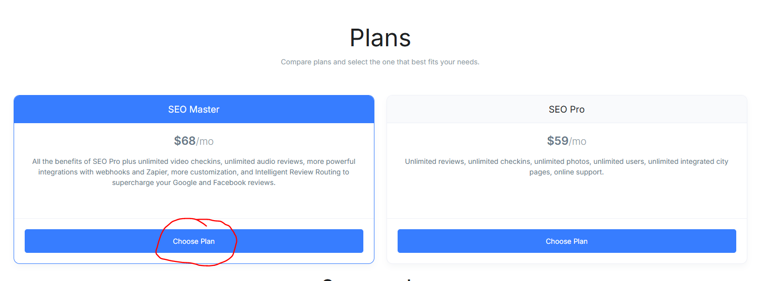 When choosing a plan, ALWAYS choose SEO Master and click Choose Plan.