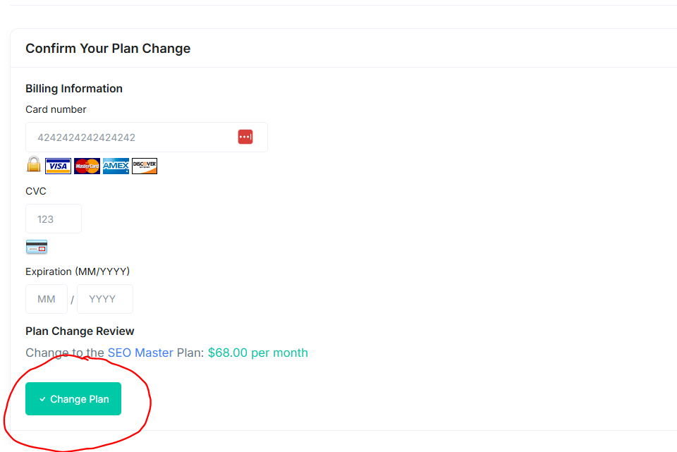 On the next screen, use LastPass to fill out the CC info and click Change Plan.