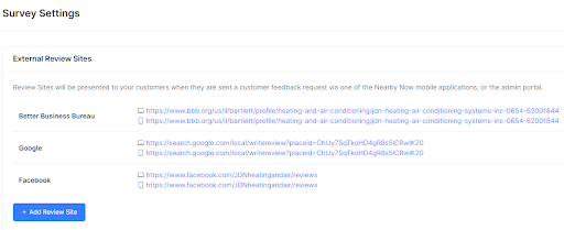 In the External Review Sites section add the customers GBP Reviews link, Facebook, and BBB (Only if they are accredited).
