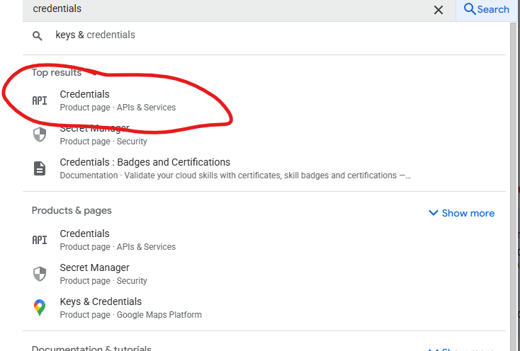 Once you are in the correct project, in the search bar at the top, search Credentials and click to open the API key.